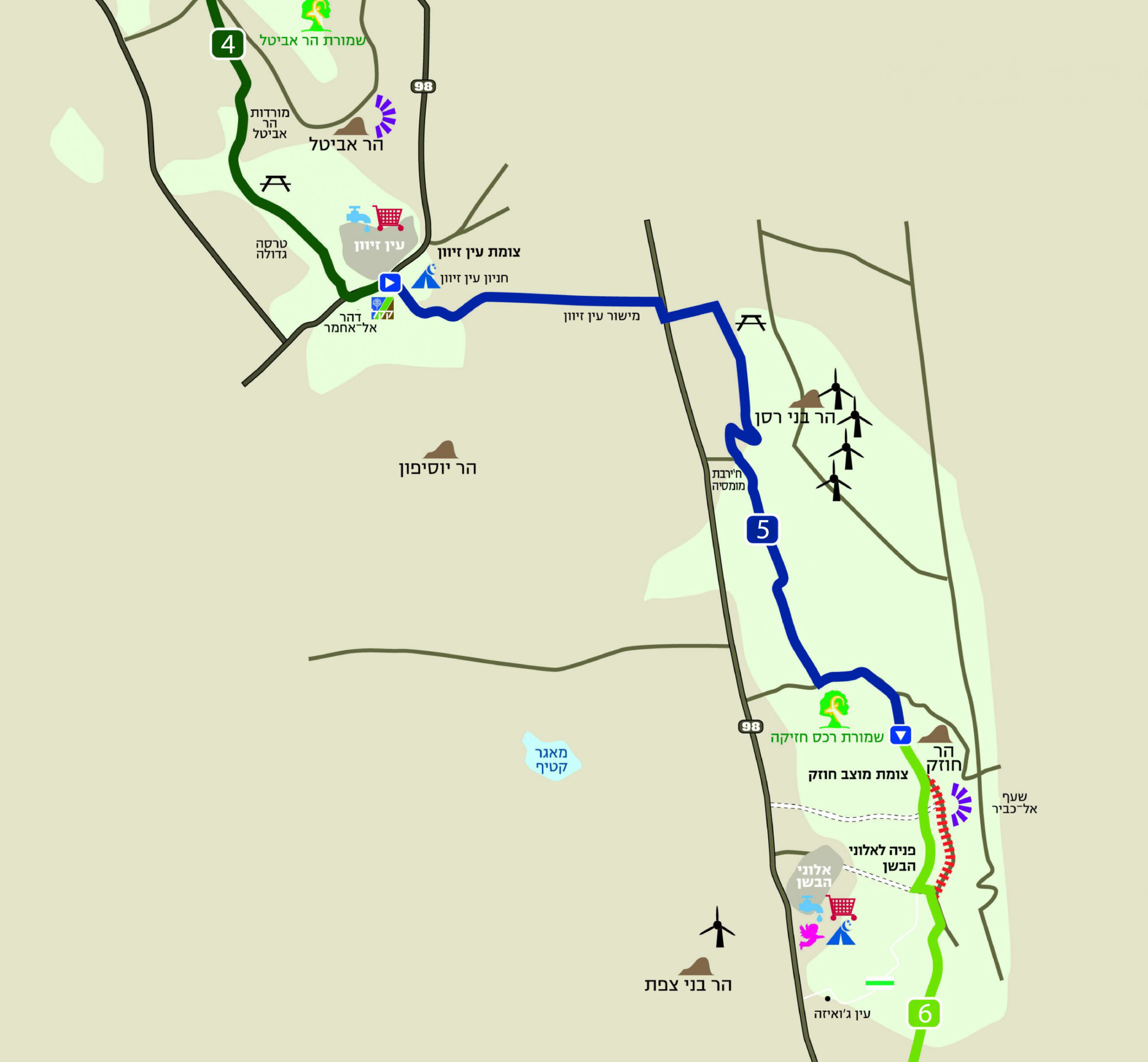 - Drinking water: Ein Zivan campsite, and as you cross Road 98 and ascend to the wind turbines